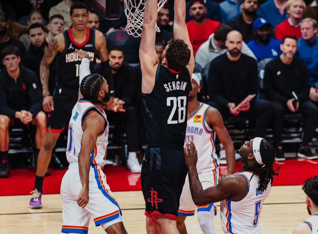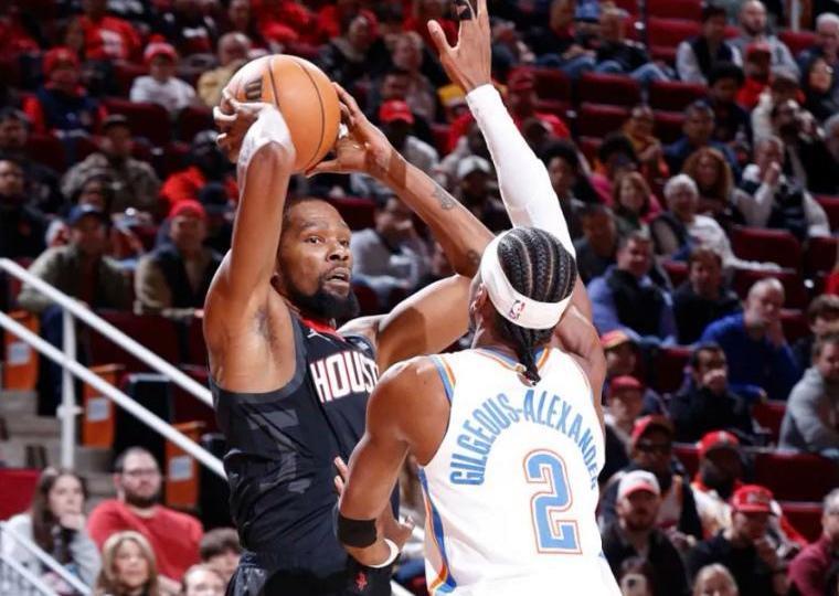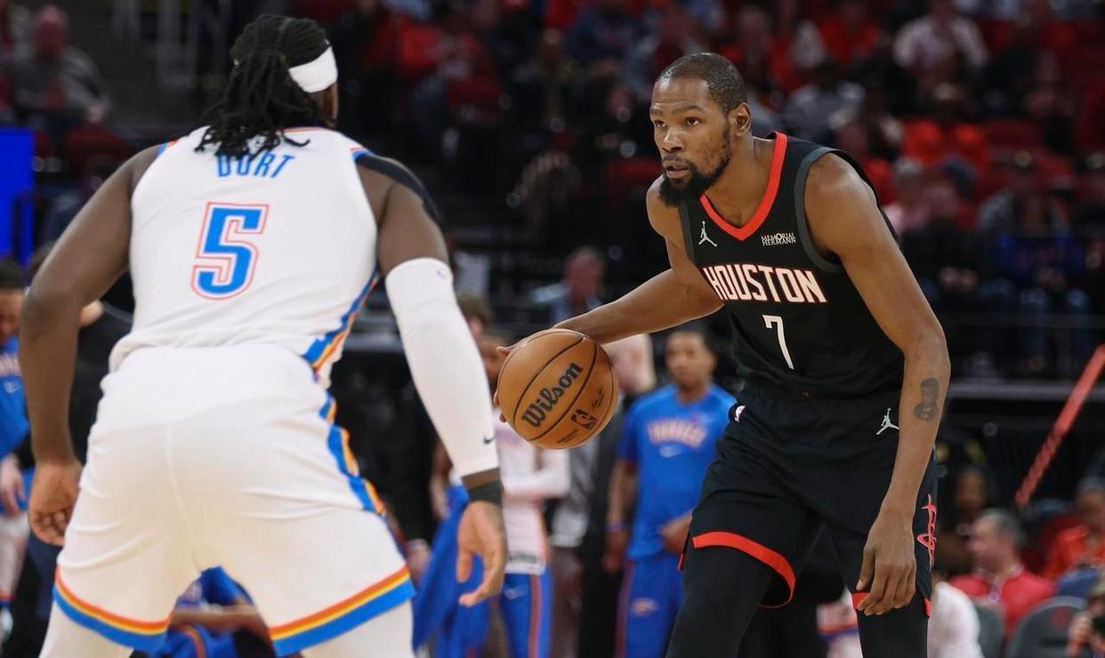 NBA常规赛,火箭坐镇主场迎击雷霆。本场比赛之前,火箭23胜14负排名西部第6,过去4场比赛他们输掉3场,被开拓者双杀,惨败倒数第一的国王,从阵容上看,火箭真的很强,全员天赋都是顶级,联盟平均身高最高的一支球队,去年夏天还引进了超级巨星杜兰特。然而,一番比赛下来却发现,光有天赋还是不行,火箭现在的投射有点糟糕,连着几场三分命中率都只有两成,再加上缺少控卫组织,他们暂时很难上升到争冠高度。另一边的雷霆队,34胜7负排名西部第一,近期雷霆又轰出4连胜,他们依然是现在最有统治力的一支队伍。