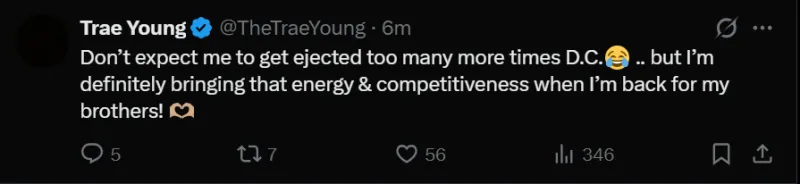 特雷-杨随后更新X:“别指望我还能被驱逐多少次,华盛顿……但当我为兄弟们重返赛场时,绝对会带着那股劲头和斗志!”